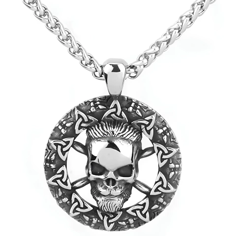 Este colar de estilo viking é uma peça impressionante e única, perfeita para quem aprecia a cultura nórdica e a simbologia celta. O pingente é composto por uma caveira viking detalhada, cercada por um círculo de símbolos celtas que reforçam a estética e o significado do design. A corrente robusta completa o visual, garantindo durabilidade e conforto ao usar.